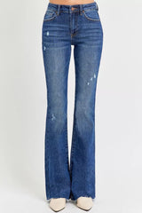 Elevate your denim collection with these distressed mid rise flare jeans. The flare silhouette adds a vintage-inspired touch to your look. The distressed detailing gives these jeans a cool and edgy vibe. The mid rise waist provides a comfortable and flattering fit. Style these jeans with a boho blouse and platform shoes for a retro-chic ensemble.