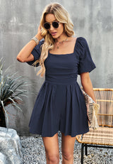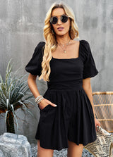 The Kaci romper is detailed with flattering smocked bodice. Features solid color, square neck line, short sleeves, and regular fit PLUS, it has pockets. Pair it with a headband and sneakers for a fun look.