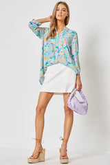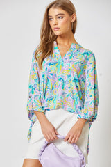 The signature lizzy top features poly blend which features luxurious softness with lightweight, wrinkle free comfort. This easy care fabric top is travel friendly, cooler than linen and other materials which makes your perfect ON THE GO wear. Lizzy top also features china collar neckline with 3/4" length sleeves with tab details. The fit is relaxed, flowy fit with slight high low.