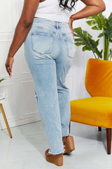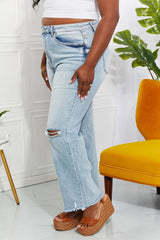 With a high waist, light wash, and distressed detailing, these straight cut jeans will take you right back to the 90's. We love the cat's whiskers fading on the thighs and the raw hem that give these jeans a well-loved look.