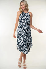 This Blue Zone Tied Ruched Dress features a delicate floral print with a flattering tie-back detail and sleeveless design. Crafted with moderate stretch fabric, it offers both comfort and a tailored fit. The knee-length silhouette is enhanced by a graceful dolphin hem, combining elegance with a contemporary touch. Perfect for occasions where refined style meets effortless charm.