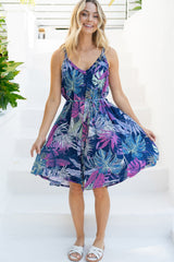 The Sleeveless Tropical Print Dress, a vibrant and stylish piece that exudes summer vibes. Whether you're vacationing on a tropical island or simply enjoying a sunny day, this dress is a must-have for your summer wardrobe. Self tie belt, ruching.