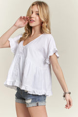 This Babydoll Crazy Top features a playful button-down front and charming ruffles that add a romantic touch to your look. Its relaxed fit ensures all-day comfort, while the versatile design makes it easy to dress up or down for any occasion. Perfect for those who love a mix of whimsy and style!