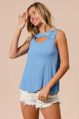 Stay cool and comfy all day in this Cut Out Front Top - Denim. Crafted from smooth, slightly stretchy rayon span knit, it feels soft against your skin and moves with you. The sleeveless design keeps things breezy, while the longer length adds a fun, flattering twist to your casual look. Perfect for effortless style with a playful edge!